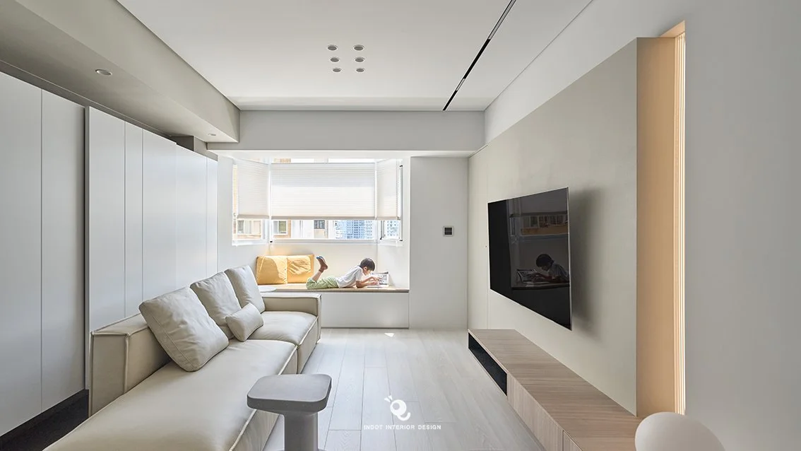 客廳沙發後方預留較深的櫃體可以當儲藏室使用,窗邊轉角做了臥榻增加收納外,也可以變成沙發的延伸。