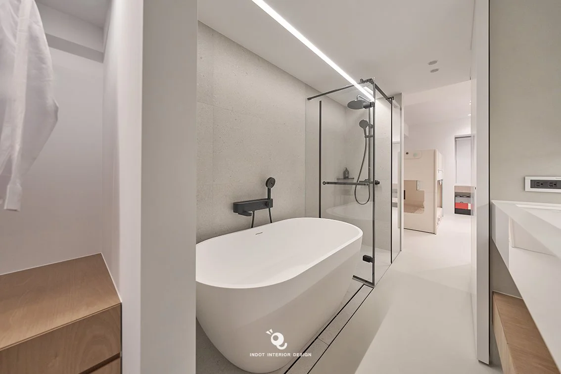 最有趣的部份就是這空間,我們把主浴加大變成類似日本多件式配置,創造了雙面開口,浴室不只是浴室也是通道一部分,這樣也創造了主臥室與小孩房的連結,也方便就近照顧小朋友,空間也變得很穿透。