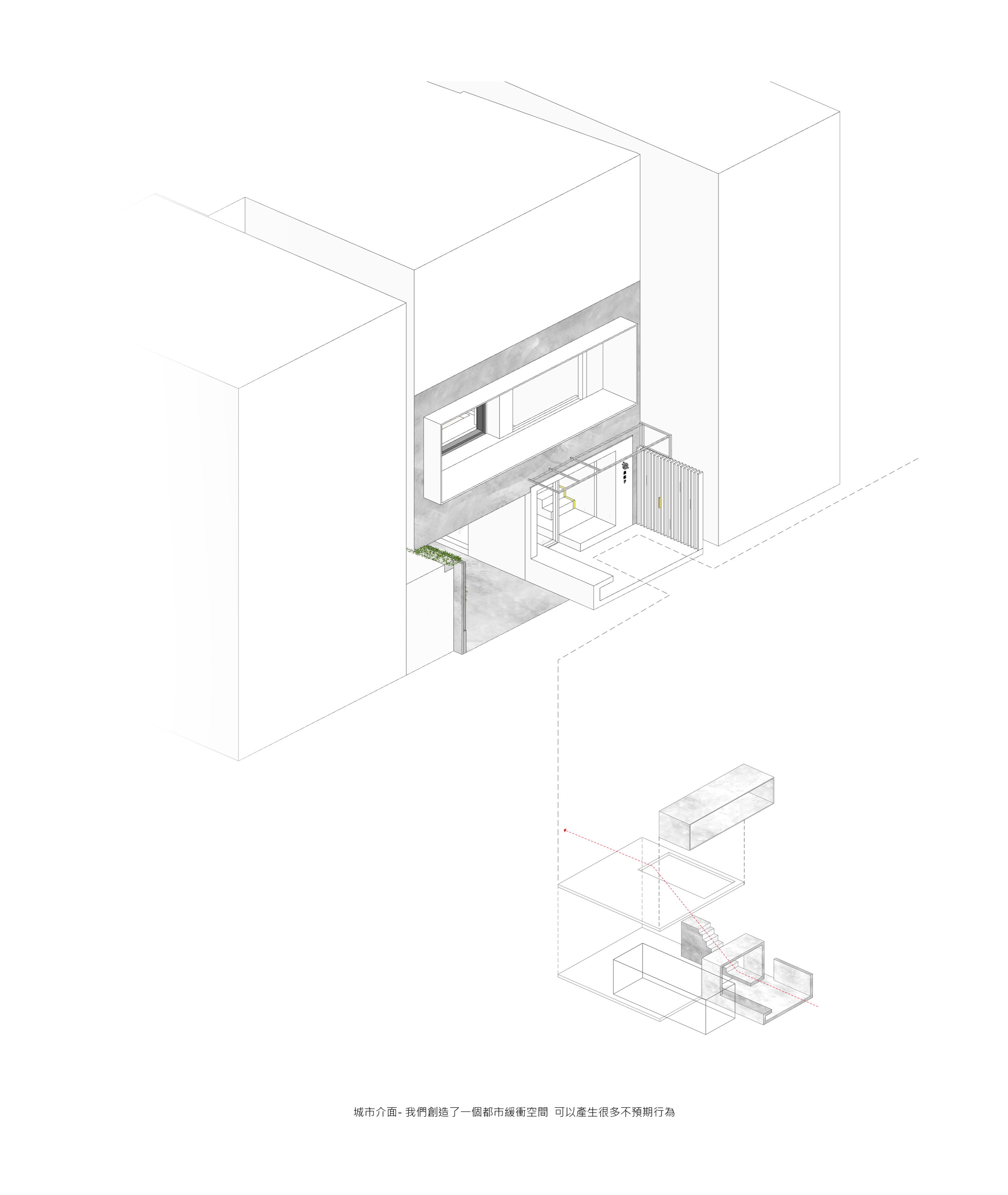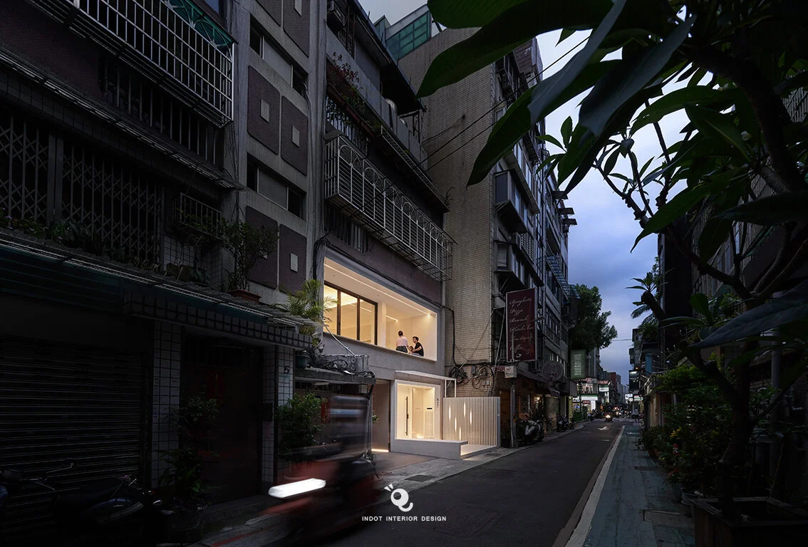 這是一間位於台北市50年的老公寓,我們將入口退縮形成一個巷道內的緩衝空間,期待在擁擠的街道發生一些不預期的行為。