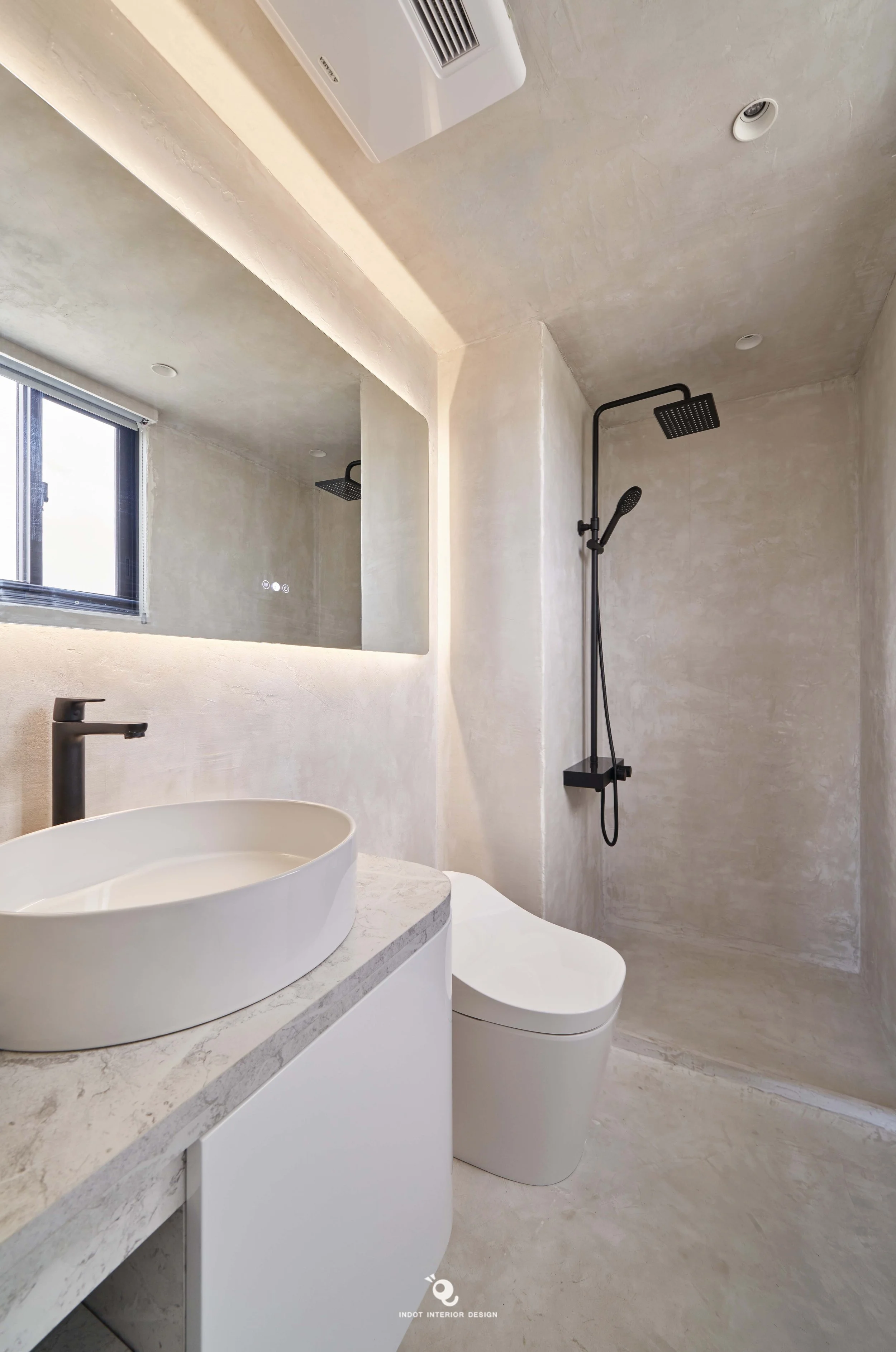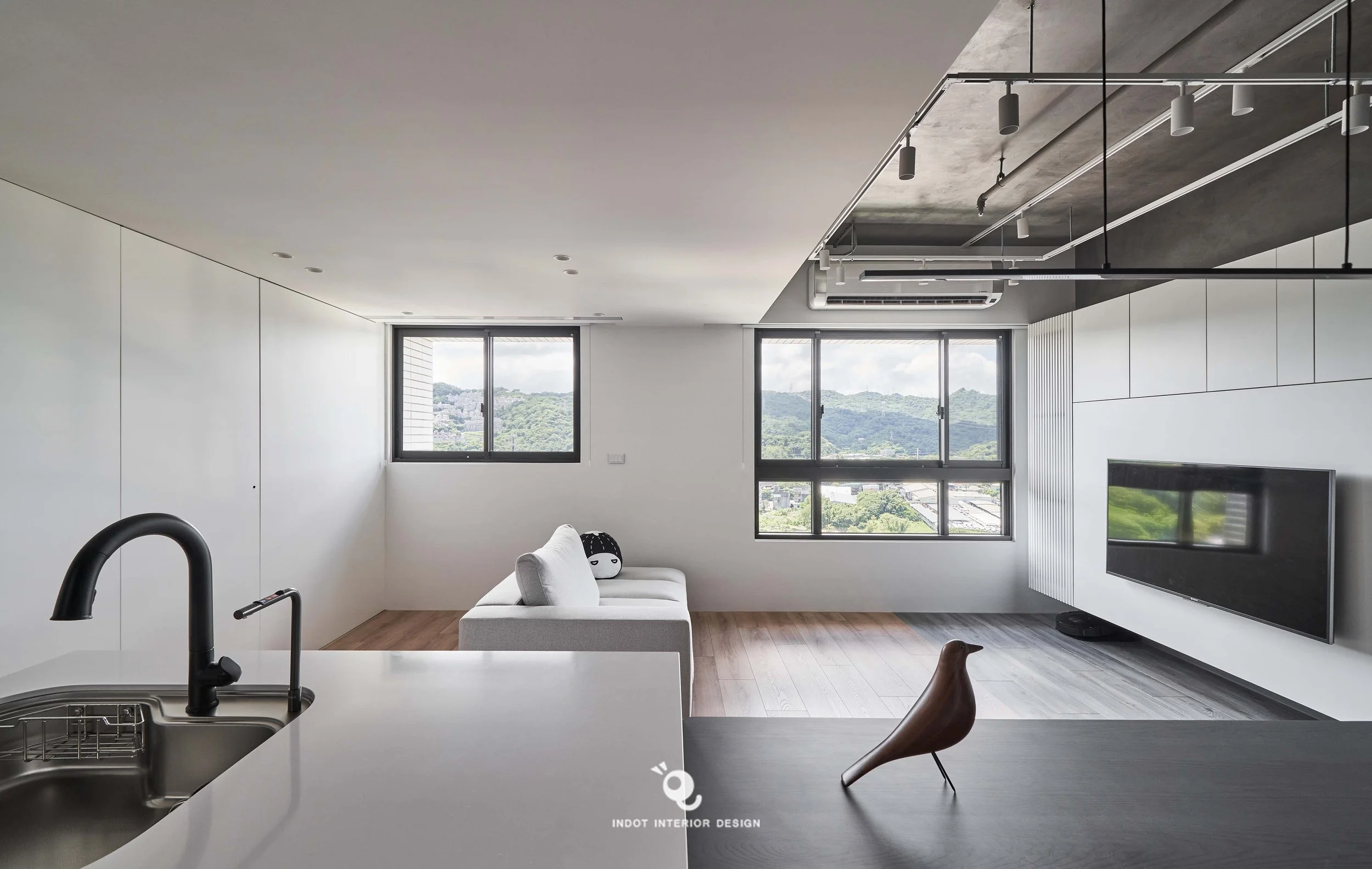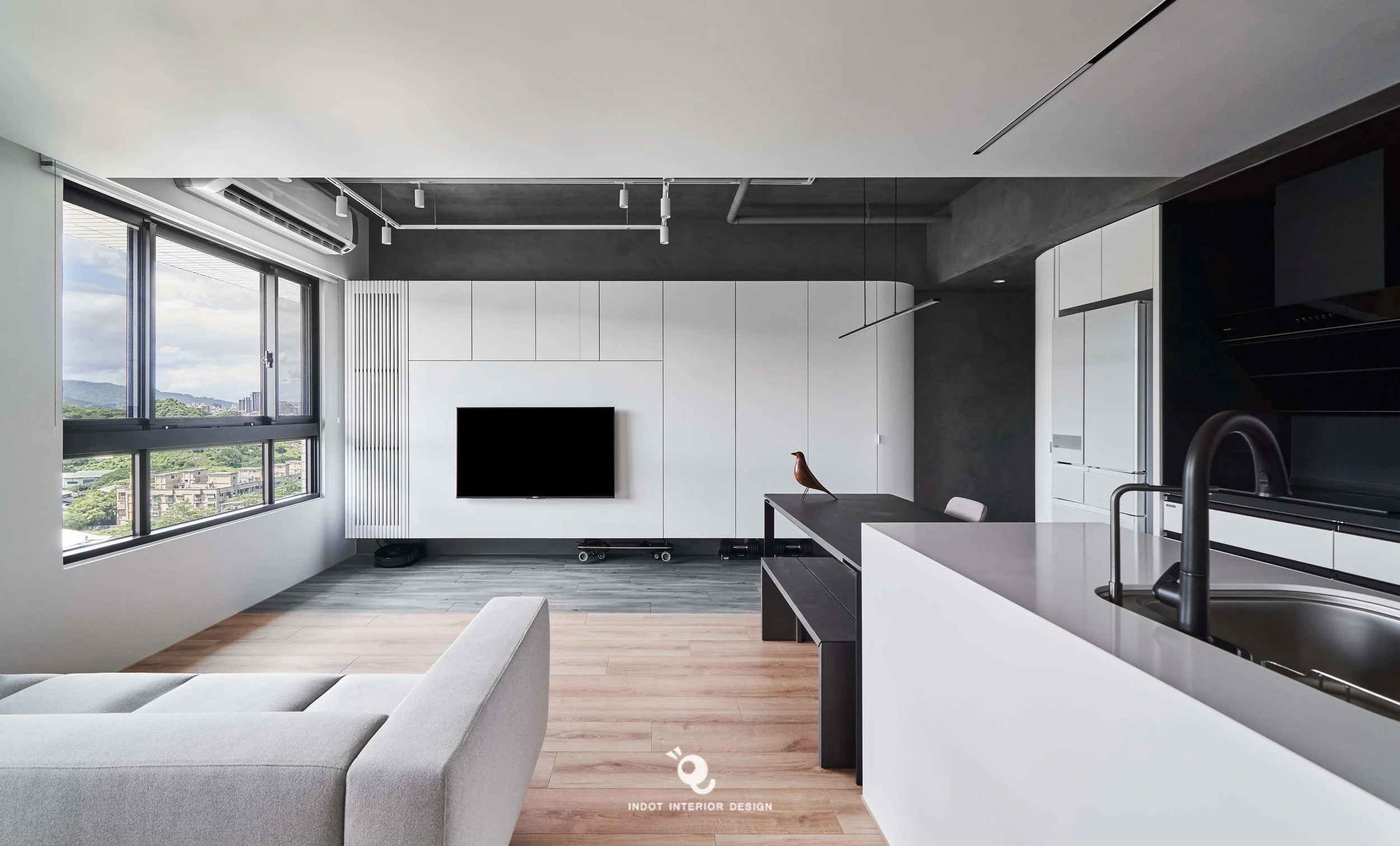 我們在客廳局部保留原始天花,並用灰色塗料界定,地板也用兩種顏色木地板分隔,客廳除了電視牆收納,希望其他牆面都能留白,留給屋主日後增加不同的生活風格,想要特別說這場屋主的參與度很高,因為主浴的塗料是屋主自己手工花很多天做的,雖然坑坑巴巴的但是也很有風格XD