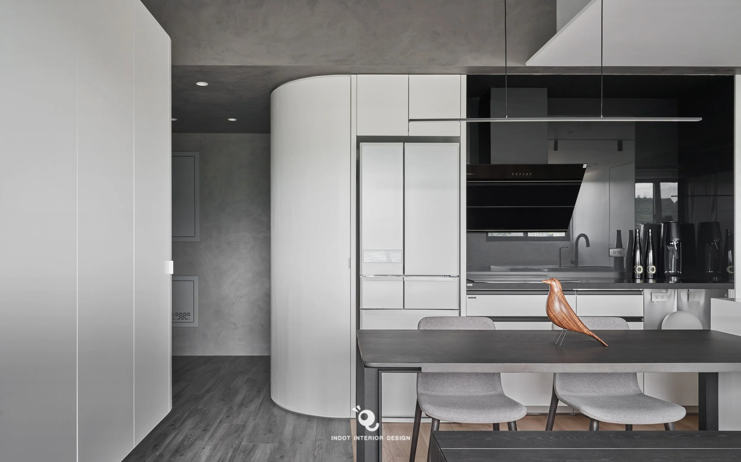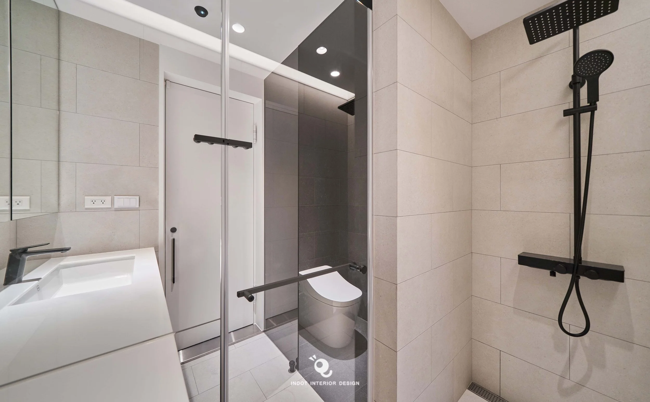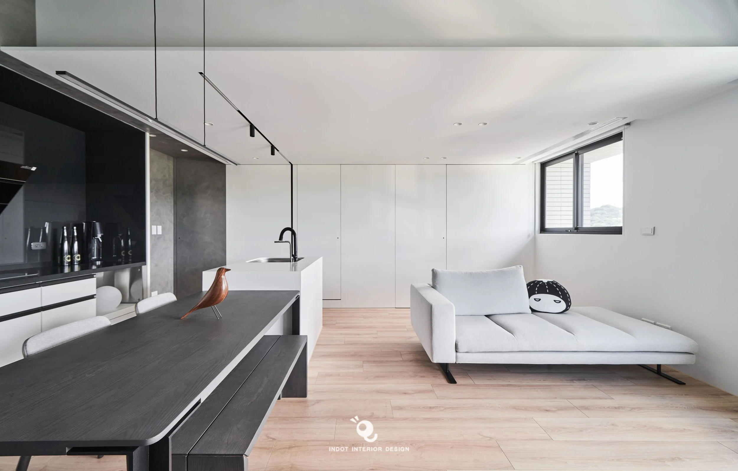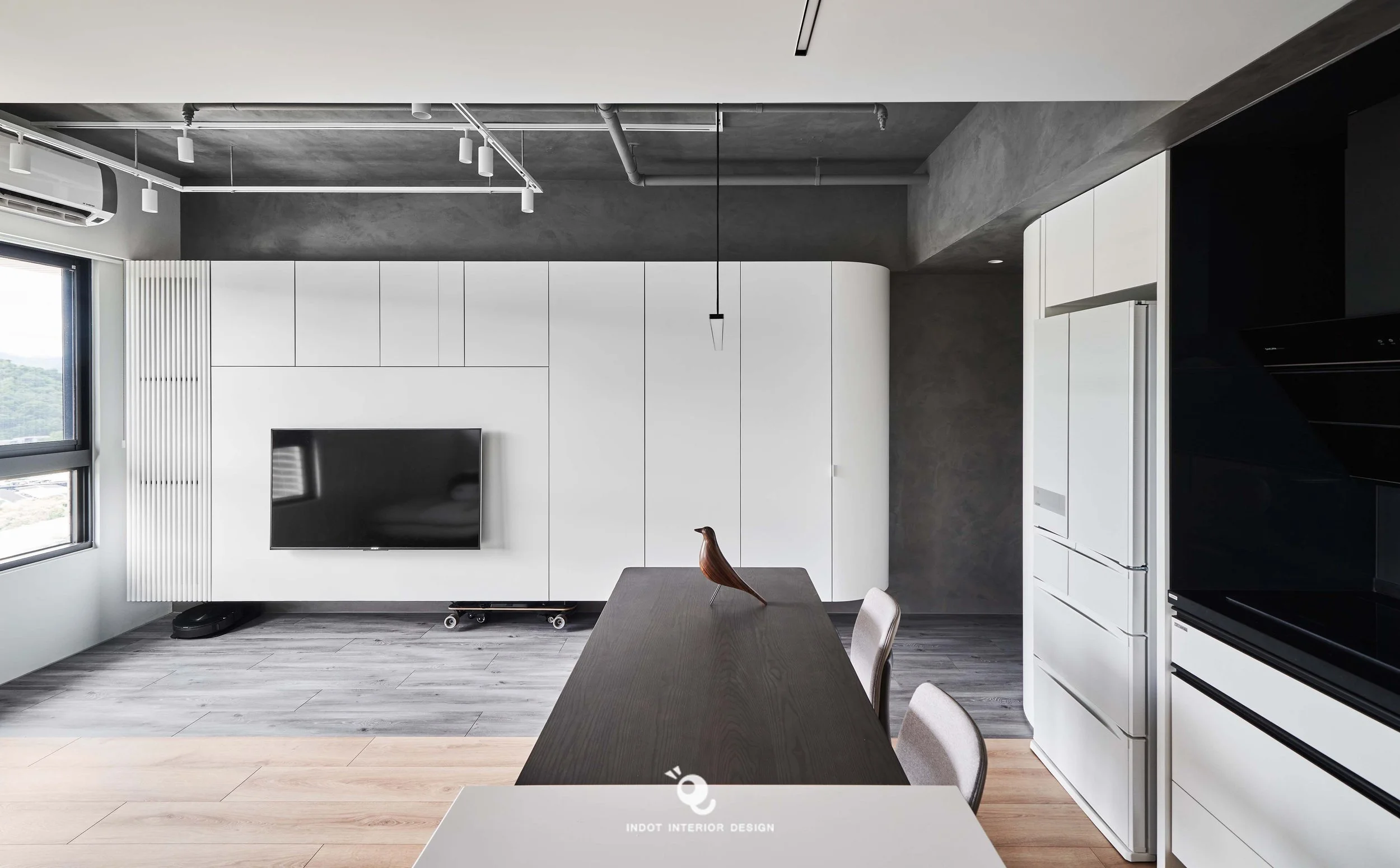 這個室內坪數大約22坪,因為居住成員只有屋主與狗狗,所以只需要兩房為主,格局經過局部調整,把原有浪費浪費的走道變成客浴,公共空間也更方正,因為對屋主來說大部分時間都在客餐廳,所以希望房間不用太大,把大部分空間留給公領域。